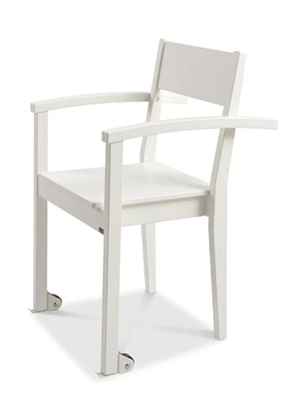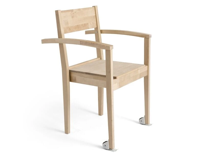 Jämäkästä puusta valmistettu Joki seniorituoli käsinojilla ja työntökahvoilla, etujaloissa liukupyörät. Kotimainen tuoli, joka on ulkonäöltään sekä siro että selkeälinjainen ja jossa on helppo istua. Hoitotyössä tuolia vaivaton siirtää huoneissa tuolin käsinojien jatkeena olevien työntökahvojen ja etujalkojen alla olevien pyörien avulla.