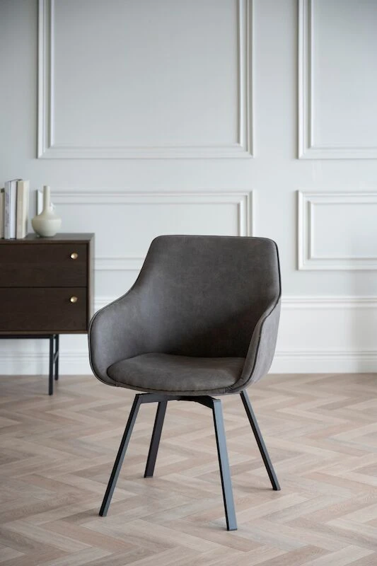 Tyylikäs ja moderni kääntyvä Rowico Alison tuoli on kangasverhoiltu, jossa mustat pulverimaalatut metallijalat. Sopii yhtälailla ruokapöydän tuoliksi kuin oleskelutilaan. Pehmustettu istuin ja korkeat käsinojat tekevät tuolista mukavan istua. Istuimen sisällä oleva puu on 100% FSC sertifioitua.