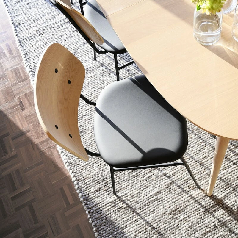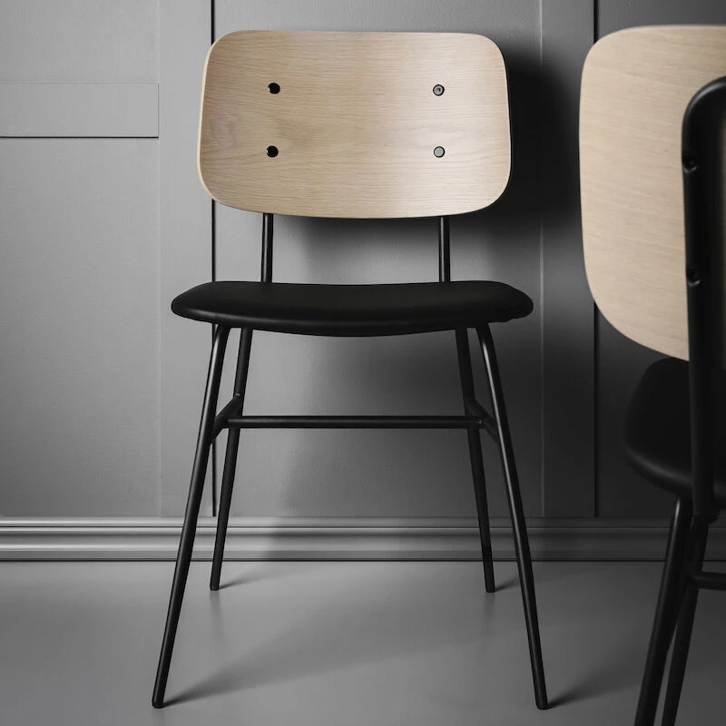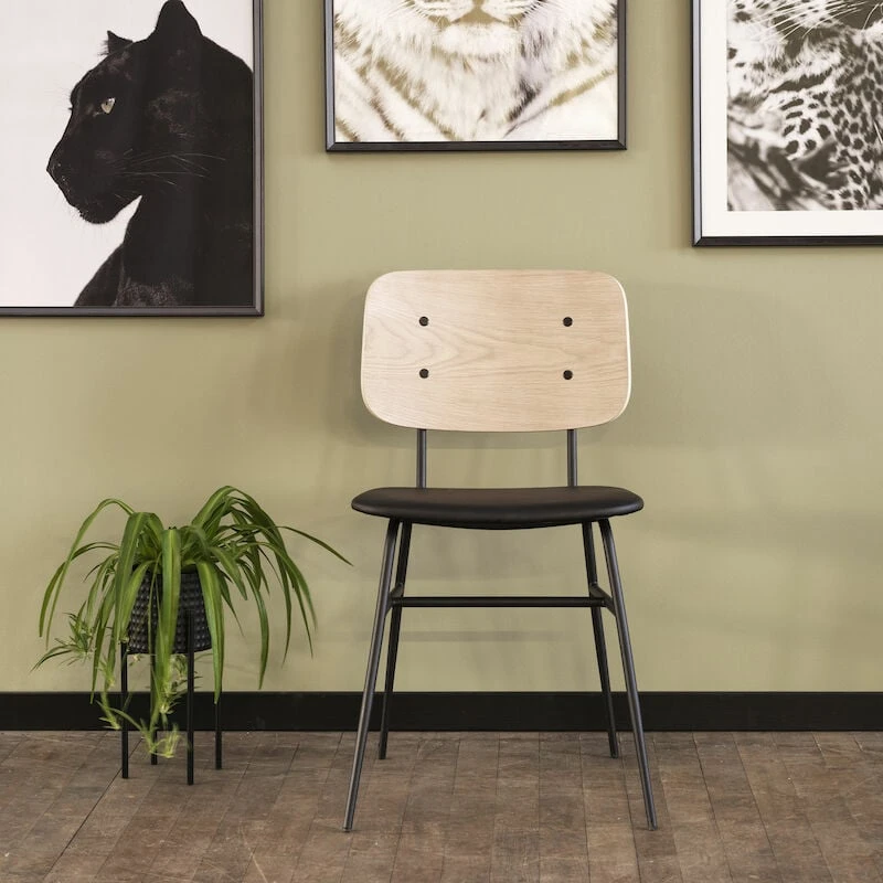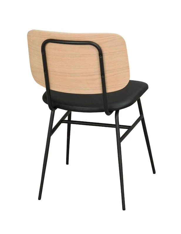 Rowico Brent tuoli modernilla ja sirolla muotoilulla. Puinen selkänoja ja pehmustettu musta istuinosa. Tuolin selkänoja on tammiviilua ja jalat ovat metallia.
