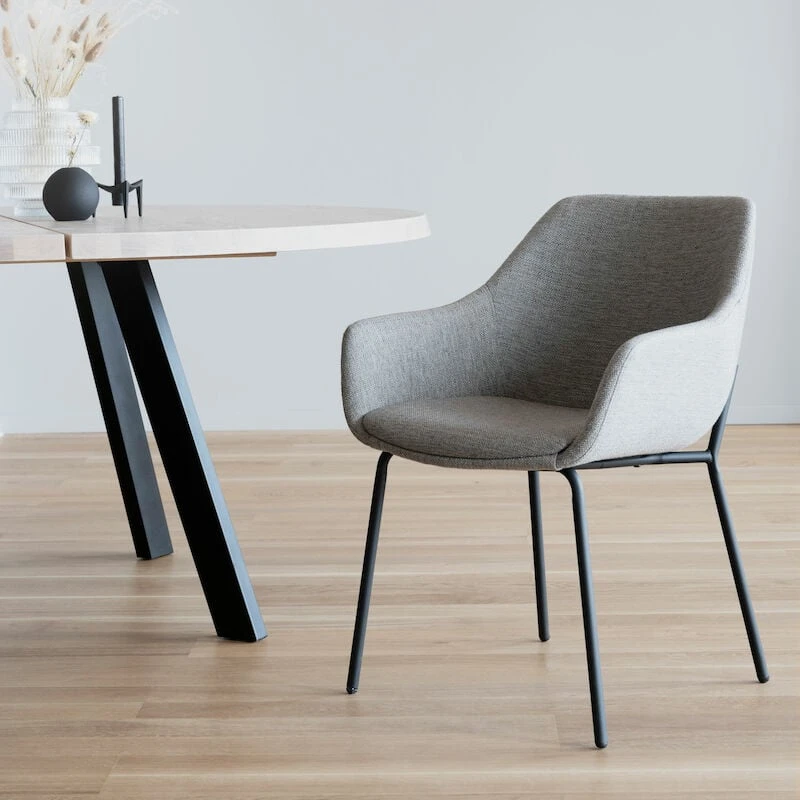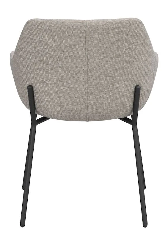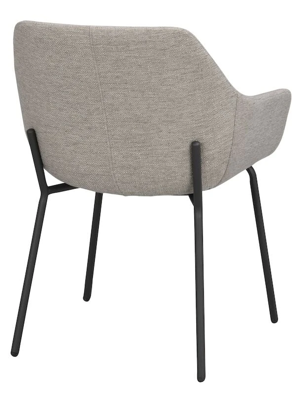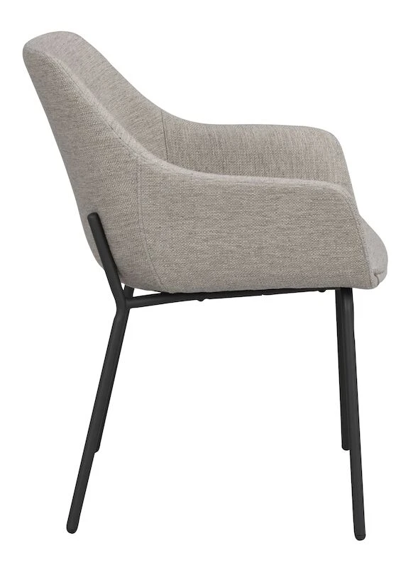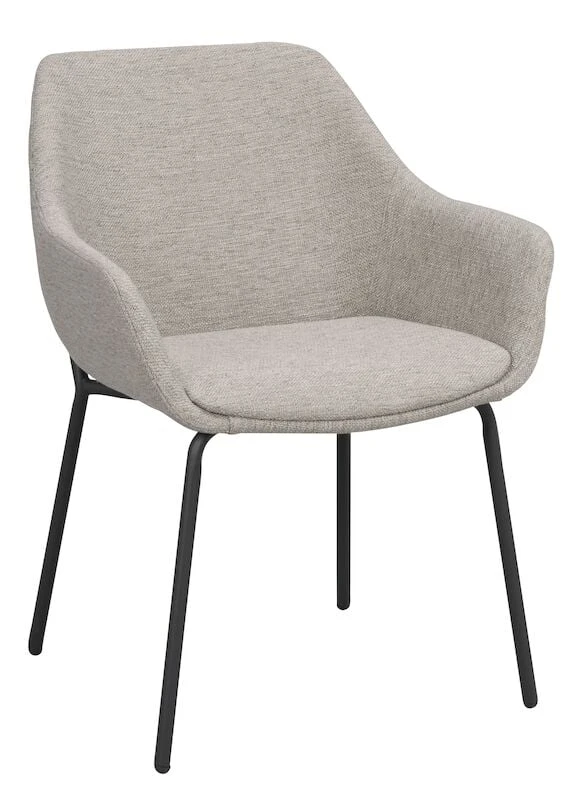 Tyylikäs kangasverhoiltu Rowico Haley tuoli käsinojilla. Istuinosa on pehmustettu ja verhoiltu laadukkaalla huonekalukankaalla. Kankaan martindale, eli hankauskestävyys on 50 000 ja materiaali on 100 % polypropeenia. Tuolin jalkaosa on mustaksi maalattua metallia.