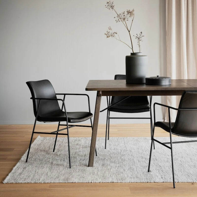 Tyylikäs ja moderni käsinojallinen tuoli ruokapöytään tai lisäistuimeksi olohuoneeseen. Paksuhkot metallijalat tekevät tuolista tukevan, mutta ilmavan näköisen. Näyttävä tikkaus viimeistelee keinonahkaisen istuinosan.