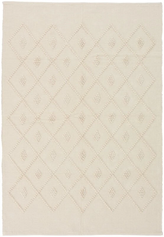 Kauniisti kohokuvioitu Hiutale puuvillamatto. Matossa salmiakkikuvioinen kohokuviointi maton keskiosassa, muilta osin matto on kudottu sileäksi. Luonnonläheisellä sävyllä saat sisustukseen lämpöä ja kodikkuutta. Maton hillitty sävy sopii monen kodin sisustukseen.