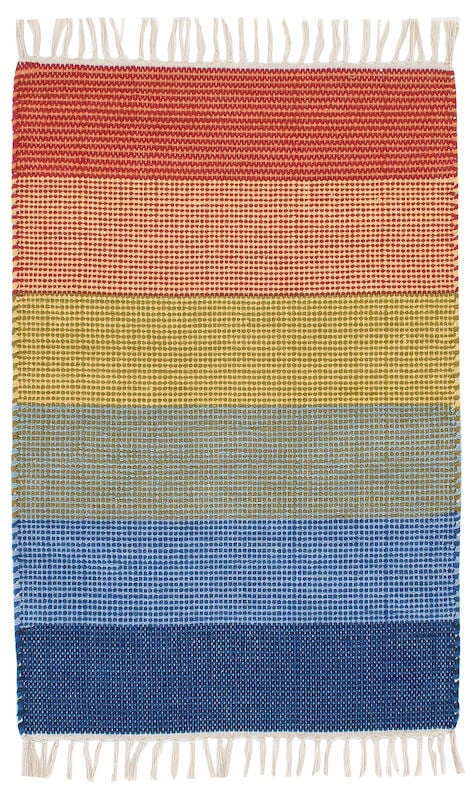 Iloisen värinen raitakuosinen puuvillamatto esimerkiksi lastenhuoneisiin ja keittiöihin. Maton on käsin kudottu ja sen päissä on perinteiset hapsut. Tuo sisustukseen leikkimielisyyttä ja väriä tällä kauniilla ja helppohoitoisella .